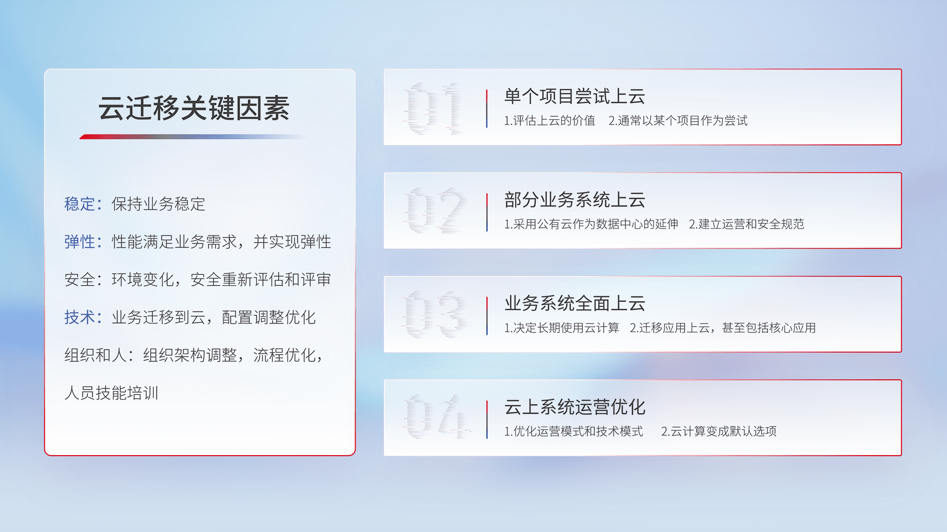 结合实际业务,,从规划设计、、、云平台选型、、、、云原生改造、、数据迁移、、集成交付,,,,迁移全过程为客户识别最佳上云路径,,做好风险识别管理,,,,设计网络架构、、身份权限、、、、安全审计合规、、、、操作审计、、日志审计、、监控告警策略、、、、多站点容灾设计等,,,对云上基础设施进行整体规划,,,,提升IT治理水平,,,,以满足弹性、、、高可用、、、、高性能的需求。。。。