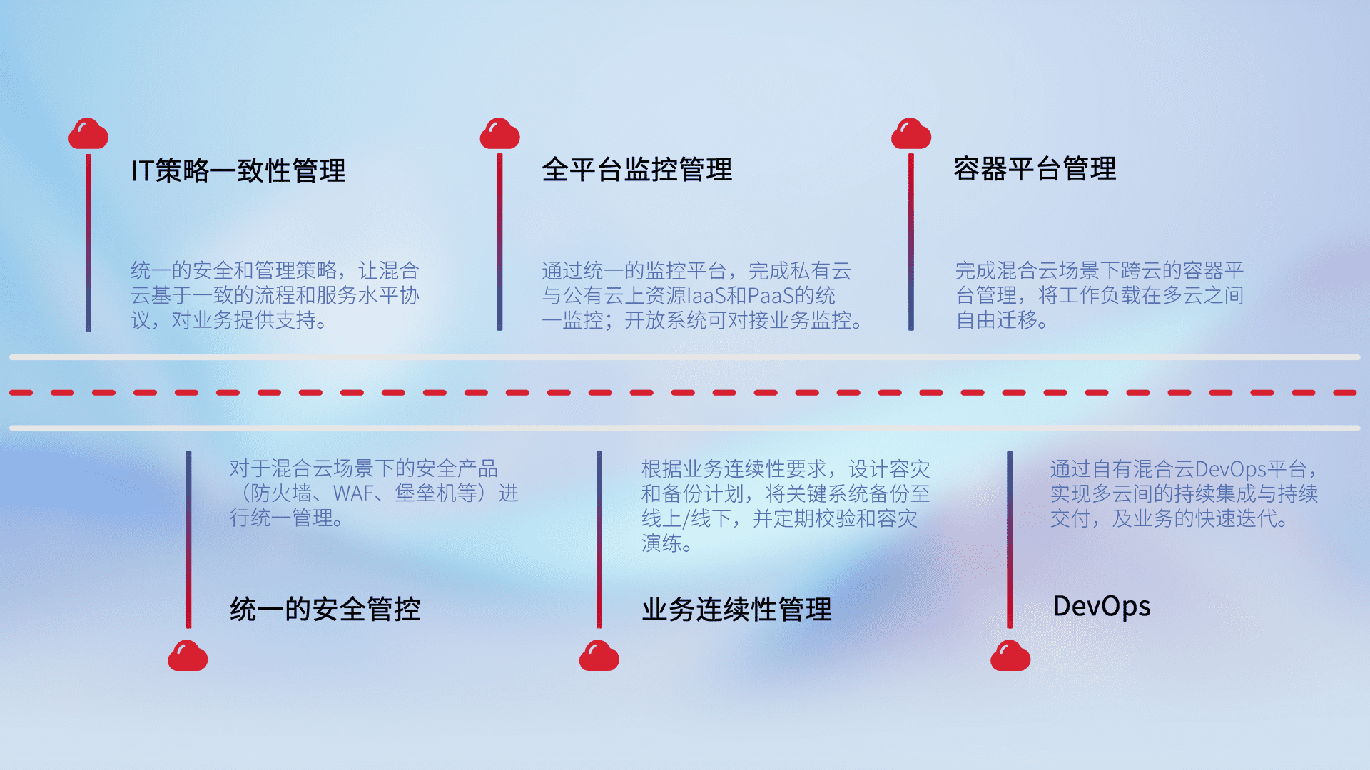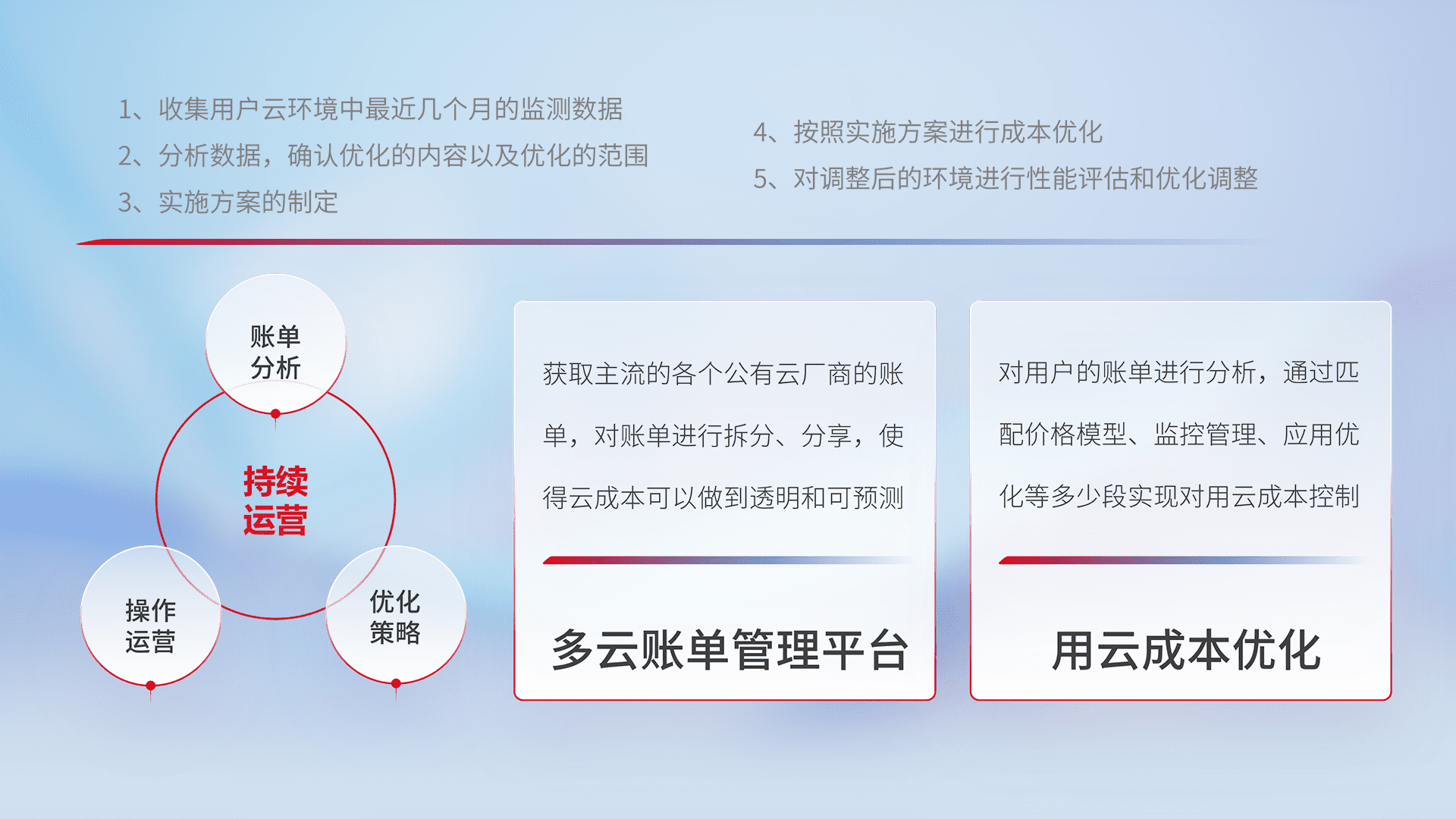 通过多云纳管,,,以统一的资源数据模型把客户的云资源进行抽象和封装,,,进而实现对多云资源的统一操作,,,保障云资源管理的可靠性、、、、稳定性与可用性。。。。量身定制化运维内容,,,配置、、开发运维、、、补丁管理、、、、备份、、、监控、、、认证和访问管理、、审计和日常巡检等,,,,保障在用云过程中的可靠度,,稳定度以及高可用率。。